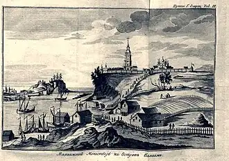 К 1730 году возведена Успенская церковь, построена деревянная ограда, но пожар 1754 года уничтожил эти первые постройки. Императрица Елизавета Петровна прилагала усилия для восстановления монастыря, но в 1765 году в нём жило всего 11 монахов.