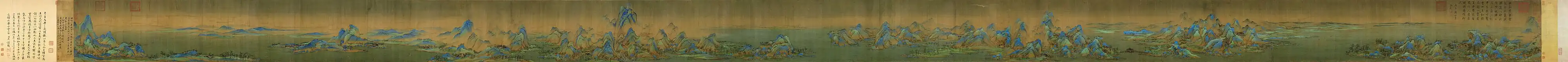 Свиток размером около 12 метров в длину и более полуметра в ширину представляет собой одну из самых больших картин, созданных за всю историю китайской живописи. Художник изобразил грандиозную панораму гор и вод в соответствии со старинным стилем так называемого сине-зелёного пейзажа, выработанным во времена династии Тан аристократами из царствовавшего семейства Ли. Этот стиль с характерным использованием глубоких синих и зелёных пигментов и золота как символ аристократизма и изысканности был перенят от танского императорского дома Ли представителями сунского императорского семейства Чжао, и поддерживался ими даже после падения своего государства (об этом свидетельствуют работы Чжао Мэнфу). Живопись свитка исполнена детальным стилем (гунби), она в большой мере отличается от бытовавшей в среде интеллектуалов той поры техники туманного пейзажа, который выполнялся размывами туши, делающими очертания гор и прочих предметов нечёткими. Художник дал картину грандиозности мироздания, отчётливо выразив изначальную суть китайского пейзажа «шань-шуй» — гармонию противоположностей: горной тверди и текучести воды, вечного и переменчивого, инь и ян. Ван Симэн тончайшей кистью выписал множество явлений жизни, порождённых этой гармонией, изобразил людей, зверей и птиц, воду в разных состояниях, детали быта, деревья, и лодки рыбаков, дома и великолепный мост с крытыми террасами, где путники могут передохнуть и так далее. Художник соединил классичность старинного сине-зелёного стиля с изящным реалистическим рисунком, характерным для периода Сун, и светящейся золотистой атмосферой, придающей пейзажу глубокую поэтичность. Это произведение можно считать светским, и, может быть, несколько поверхностно-детальным прочтением глубокой философско-религиозной сути китайского пейзажа «шань-шуй», который всегда был выражением фундаментальной духовной идеи.