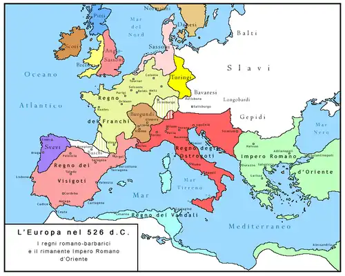 - Королевство остготов. В 488 году император Флавий Зенон заключил с остготским королём Теодорихом соглашение, согласно которому Теодорих в случае победы над Одоакром становился правителем Италии в качестве представителя императора. В 493 году цели соглашения были достигнуты. В 555 году при императоре Юстиниане I итальянское королевство остготов было завоёвано Византией.
