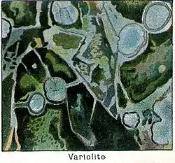 Эти шарики, в разрезе или изломе породы являющиеся в виде круглых пятен, иногда собираются целыми группами, иногда рассеяны поодиночке. Отличаясь несколько от промежуточной массы горной породы, так назыв. «основной её массы» по химическому составу, большой твёрдостью и менее легко поддаваясь разрушающему действию выветривания, шарики (или «вариоли») на выветрелой поверхности горной породы выдаются в виде оспин; отсюда произошло и само название вариолита, т. е. оспенного камня — от слова variola, оспина. Впоследствии были найдены другие коренные местонахождения этой редкой породы. К ним относятся: Савойя, Фихтельгебирге, Гарц, также Олонецкая губерния в Российской империи (Ялгуба на территории современной республики Карелия) и некоторых других местах. Изучение микроскопического строения, минералогического и химического состава доказало принадлежность вариолита к группе зеленокаменных пород, что в свою очередь дало возможность признать в вариолите контактное видоизменение диабаза. По новейшим исследованиям эти породы представляют не что иное, как сферолитовые разновидности авгитовых порфиритов, а потому название «вариолит» является чисто структурным термином, подобно слову «сферолит».