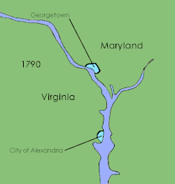 В 1751 году, когда законодательный орган Мэриленда выкупил шестьдесят акров земли у Джорджа Гордона и Джорджа Биелла за 280 фунтов[17], был основан Джорджтаун; примерно в это же время, в 1749 году, была основана Александрия. Джорджтаун был самым верхним по течению реки Потомак пунктом, до которого можно было подняться от океана на торговых судах. Джорджтаун превратился в процветающий порт благодаря торговле и транспортировке табака и других товаров из колониального Мэриленда[18].