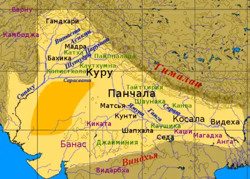 Карта ведийской Индии начала железного века. Ведийские царства выделены чёрным цветом, иностранные племена — фиолетовым, ведийские школы Шакха — зелёным, пустыня — оранжевым.