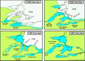 Великие озёра начали формироваться в конце последней ледниковой эпохи, когда масса ледника продавила земную кору, а после того, как ледник растаял, начался медленный обратный процесс — гляциоизостазия. Водная масса озёр образовалась при таянии ледника и первоначально текла в направлении бассейна Миссисипи, но по мере поднятия коры сток сместился в сторону долины реки Святого Лаврентия.