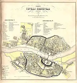 Особенностью Новгорода является то, что он всегда был и остаётся разделён на две части — Торговую и Софийскую стороны, границей между которыми является река Волхов. В прошлом это деление носило не только географический характер, но отражалось и на внутренней истории города. Соперничество жителей Торговой и Софийской сторон нередко приводило к открытым столкновениям на Великом мосту через реку. Средневековый город сложился на месте более ранних селений у истока Волхова из Ильменя, где сгусток стоянок и поселений прослеживается со времён неолита (4—3 тысячелетия до н. э.)[31][32][33]. Обзор досредневековых реалий Новгородской земли подробно даётся в ряде материалов[34].
