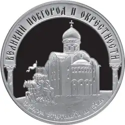 Против часовой стрелки, с правого верхнего угла: памятник «Тысячелетие России», Софийский собор, музей изобразительных искусств, Свято-Юрьев монастырь, Детинец, Ярославово Дворище