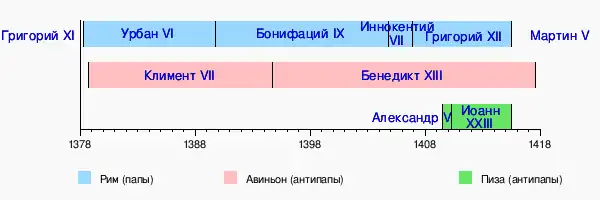 В результате борьбы возникли римская линия, которую последовательно представляли Урбан VI, Бонифаций IX, Иннокентий VII и Григорий XII, и авиньонская линия, которую представляли Климент VII, а затем Бенедикт XIII. Конфликт усугублялся политическими и дипломатическими разногласиями в Европе.
