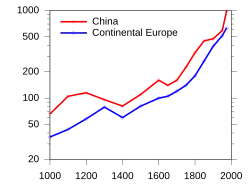Китай на протяжении всей нашей эры имел большую численность населения, чем Европа, и в отличие от неё, Китай был политически объединённым в течение длительных периодов[25]. Во время династии Сун (960—1279) в стране произошла революция в областях сельского хозяйства, водного транспорта, финансов, урбанизации, науки и техники. Около 1100 года китайская экономика стала самой передовой в мире[26]. Технология заливного поля для выращивания риса открылась для доселе слаборазвитого юга страны, в то время как северный Китай оказался опустошён в результате набегов монголов и чжурчженей, а также наводнений и эпидемий. Центры промышленности, а также население переместились от Хуанхэ на юг страны, и эта тенденция продолжалась вплоть до XV века, когда север страны стал заново заселяться[27][26]. В конце имперского периода (1368―1911), во время правления династий Мин и Цин, налогообложение было низким, а ВВП и население росло значительными темпами, хотя и без существенного увеличения производительности труда[28]. Китайские товары, такие как шёлк, чай и керамика, пользовались большим спросом в Европе, что привело к притоку серебра, расширению денежной массы и содействию росту конкурентоспособности и стабильному рынку[29]. К концу XVIII века плотность населения в Китае была выше, чем в Европе[30]. В то же время в Китае было больше крупных городов, но гораздо меньше мелких, чем в современной Европе[31].