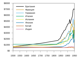 Хотя в Китае уголь использовался и раньше, ещё во времена правления династии Сун, его использование впоследствии сократилось из-за перемещения основных центров производства на юг страны (где не было крупных месторождений) из-за разрушительных нашествий монголов и чжурчжэней между 1100 и 1400 годами. Западные державы также имели преимущество перед странами Востока, располагая более крупными партиями сырья и выходом к торговым рынкам, которые располагались, в частности, в колониях. Китай и остальные страны Азии принимали участие в мировой торговле, но тем не менее колонизация принесла неоспоримое преимущество Западу[8]. В XX веке Великая дивергенция достигла своего пика к началу Первой мировой войны, на котором находилась вплоть до начала 1970-х годов. Затем, спустя два десятилетия неопределенных колебаний, в конце 1980-х годов, ей на смену пришла «Великая конвергенция» (Great Convergence) ― тогда большинство стран третьего мира достигли значительно более высоких темпов экономического роста, чем основная часть стран Первого мира[9][8].