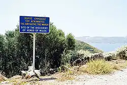 Согласно документам греческий крестьянин, открывший статую, работал «в 500 шагах (300 м) от амфитеатра (театра) и над могильными пещерами, вырытыми справа от долины, ведущей к морю». Это соответствует расположению древнегреческого города Мелос на склоне горы между деревней и морем. Последующие раскопки выявили остатки двух храмов, в том числе храма Посейдона, агору с портиками, стадион и, ниже на склоне, амфитеатр. Место, где была обнаружена Венера, находится рядом со стадионом[9]. Стадионы обычно находились под покровительством богов Гермеса и Геракла, именно их статуи чаще всего украшали место спортивных состязаний. В первых отчётах о месте находки описана «пещера» или «ниша», «арочная» или «сводчатая». Это квадратная комната шириной 1,40 м, ниже современного уровня земли (от 2,50 до 2,80 м) площадью (1,50 × 0,20 м). Именно в этом ограниченном пространстве были найдены несколько мраморных скульптур и фрагментов, но остаётся неясным, является ли это их древним местонахождением или более поздним захоронением[10].