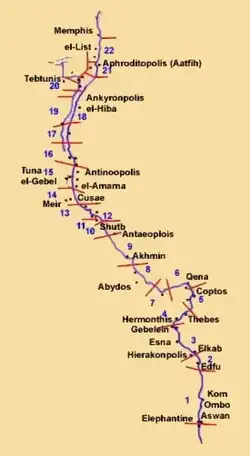 Верхний Египет представляет собой узкую протяжённую расселину в каменистом плато Восточной Сахары, через которую Нил несёт свои воды из Центральной Африки. Размытые за тысячелетия края этого плато образовали отвесные скалы, поднимающиеся в некоторых местах до 183 метров, и называемые некоторыми античными географами Ливийские горы (вдоль западного берега реки) и Аравийские горы (вдоль восточного). Длина этого огромного коридора около 800 км, а ширина до 19 км, местами долина сужается до ширины потока Нила, окружая его с обеих сторон крутыми скалами[3]:44—45.
