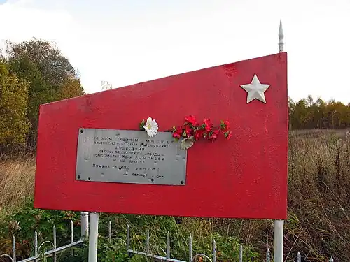 Вблизи этого места 8 марта 1942 года были расстреляны эстонскими карателями: Романова Мария Константиновна — жена командира партизанского отряда Романова М. В., Романова Евгения Михайловна — дочь командира партизанского отряда Романова М. В., связная отряда, и Романова Ольга Харитоновна — жена партизана Романова И. В. Похоронены на старом кладбище в деревне Красные Горы, недалеко от церкви в честь иконы Божией Матери «Знамение» (номер в Книге Памяти 12166). Текст на памятном знаке: «На этом священном месте 8 марта 1942 года были расстреляны фашистами связная партизанского отряда комсомолка Женя Романова и её мать. Память о них вечна! От ГПТУ-25, г. Луга»[27].