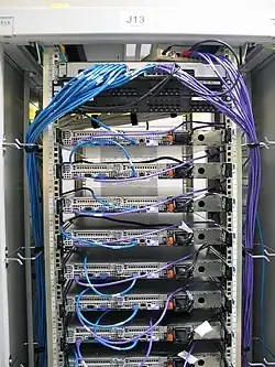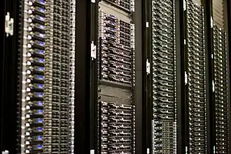 Википедия в настоящее время работает на выделенных кластерах серверов Linux (в основном Ubuntu[67][68]), с несколькими машинами OpenSolaris для ZFS. Вики-проекты Фонда Викимедиа, самым крупным из которых является Википедия, по состоянию на март 2013 года поддерживались работой нескольких кластеров, состоящих из 974 серверов[69].
