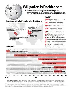 Затем к программе подключился Детский музей Индианаполиса, пригласив в 2010 году на работу добровольца проекта GLAM Лори Филлипс (англ. Lori Phillips), ставшую, таким образом, вторым в истории штатным википедистом[4]. Третий вики-резидент — Бенуа Эвеллин (англ. Benoît Evellin) — провёл шесть месяцев во дворцах Версаля[5]. Уже в 2010 году проектом заинтересовались Музей Пикассо (Барселона, Испания), Музей и художественная галерея Дерби (Великобритания)[6][7]. В том же году Смитсоновский институт выразил заинтересованность в найме вики-резидента, которым, в конечном итоге, стала Сара Стирч (англ. Sarah Stierch)[8][9][10]. В следующем году этому примеру последовало Национальное управление архивов и документации США, наняв студента Колледжа Симмонса Доминика Макдевитт-Паркса (англ. Dominic McDevitt-Parks), редактировавшего Википедию с 2004 года[11] и учившегося на магистра в области истории и управления архивами[12]. В январе 2013 года Президентская библиотека Джеральда Форда стала первой Президентской библиотекой США, пригласившей на работу штатного википедиста, которым стал Майкл Барера (англ. Michael Barera), студент-старшекурсник Мичиганского университета[13].