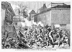 Ещё более серьёзный характер приняли недоразумения, возникшие вследствие захвата китайцами плывшего под британским флагом судна. Так как китайский наместник Иэ отказал в требуемом удовлетворении, то английский адмирал Сеймур открыл бомбардировку города Кантона, разрушил его крепостные сооружения и уничтожил китайский флот.