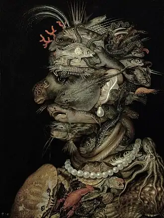 «Вода» — одна из картин цикла «Четыре стихии» в который также входят «Земля», «Огонь» и «Воздух». Аллегорический портрет Воды выполнен в жемчужно-сером холодном колорите. На тёмном глубоком фоне изображён профиль женщины. Её странный портрет полностью состоит из сплетения влажных и скользких обитателей водной стихии: разнообразных рыб, в том числе акул, кальмаров. Морские раковины, серёжка и жемчужное ожерелье служат для неё украшением. На её плече лежит осьминог. На груди — лобстер, морская черепаха и краб. В верхней части головы смешались рыбы, креветки, тюлень, морской конёк и красные кораллы[2].
