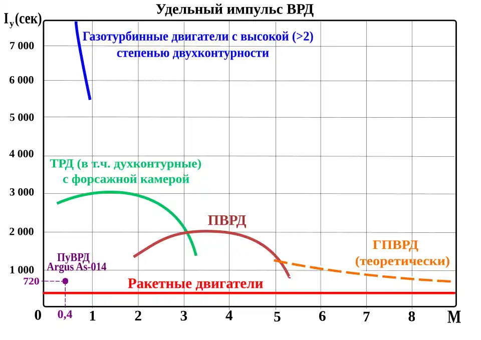 Из диаграммы следует, что по удельному импульсу ракетные двигатели (РД) значительно уступают ВРД всех типов. Это объясняется тем, что в расход топлива у РД включается и окислитель, который ВРД забирает из атмосферы, поэтому удельный импульс РД составляет максимум 270 сек для РДТТ и 450 сек для ЖРД.