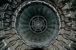 Форсажная камера ТРД General Electric J79. Вид со стороны сопла. В торце находится стабилизатор горения с установленными на нём топливными форсунками, за которым видна турбина.