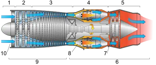 Пройдя через входное устройство, воздух попадает в компрессор низкого давления, именуемый вентилятором. После вентилятора воздух разделяется на два потока. Часть воздуха попадает во внешний контур и, минуя камеру сгорания, формирует реактивную струю в сопле. Другая часть воздуха проходит сквозь внутренний контур, полностью идентичный с ТРД, о котором говорилось выше.