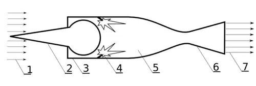 СПВРД предназначены для полётов в диапазоне 1-5 Махов. Торможение сверхзвукового газового потока происходит всегда разрывно (скачкообразно) с образованием ударной волны, называемой также скачком уплотнения. Чем интенсивнее скачок уплотнения, то есть чем больше изменение скорости потока на его фронте, тем больше потери давления, которые могут превышать 50 %.