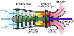 • Сжатый воздух в камере сгорания нагревается за счёт окисления подаваемого в неё топлива, внутренняя энергия рабочего тела при этом возрастает.