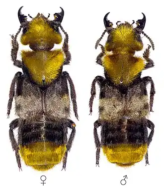 Длина тела жука достигает 28 мм[5]. Тело сверху чёрное, густо и явственно пунтированное, покрыто густым волосяным покровом; низ тела и крылья фиолетовые. Волоски оранжевого, рыже-золотистого или буро-золотистого цвета покрывают голову, грудь (кроме заднего края) и последние три брюшных сегмента. Надкрылья покрыты короткими серебристыми волосками, кроме оснований; иногда надкрылья бывают с двумя или тремя чёрными точками, образующими прерывистую линию[1][5]. Остальные отделы тела оволосены менее густо[5].