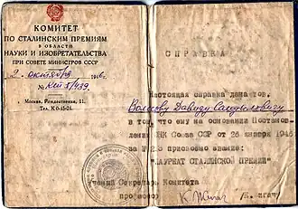 - Сталинская премия третьей степени (1946) —— за разработку конструкций и расчёт новых типов аэрофотообъективов, давших значительное повышение эффективности аэрофоторазведки
