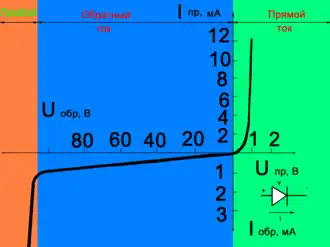 ВАХ полупроводникового диода c p-n переходом. Зелёная область — прямая ветвь ВАХ. Голубая область — область допустимых напряжений на обратной ветви ВАХ. Оранжевая область — обратный лавинный пробой p-n перехода. Масштабы по осям тока и напряжения для прямой и обратной ветви разные