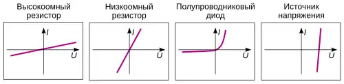 Для линейных элементов ВАХ представляет собой прямую линию (закон Ома).