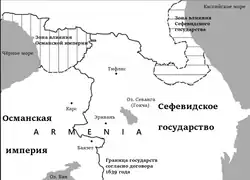 На протяжении нескольких столетий Османская и Сефевидская империи вели постоянные войны за контроль территории Закавказья и Кавказа (включая территорию Армении)[203][204][179]. Эти события стали причиной ещё более крупных волн миграции армян с ее территории, а также разорением и обезлюдиванием территории Армении и поселением кочевых курдов и тюрок на оставленные армянами земли[205][206][181]. Противостояние двух государств завершилось Зухабским мирным договором (1639)[191][207], согласно которому была установлена новая граница. Произошло ещё одно разделение Армении[208][209]. Начало новой границы было положено в районе Джавахского хребта, далее следует по реке Ахурян, граница проходила по хребту Армянских гор (западным сколам Большого Арарата) соединяясь с горной системой Загрос. Западнее новой границы оказались территории Западной (2/3 исторической Армении), восточнее — Восточной (Персидской) Армении (1/3)[82][208][8][210].