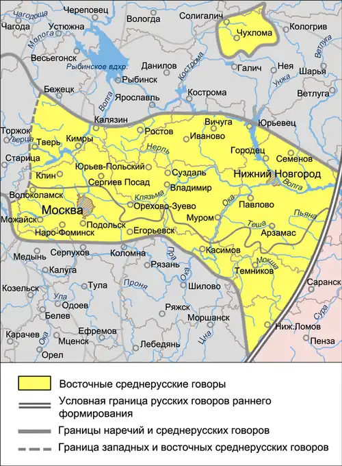 С конца XV века после объединения двух исторических центров Руси (Новгородской и Ростово-Суздальской земель) основной территорией складывающейся великорусской народности становится Ростово-Суздальская земля и, соответственно, ведущим диалектом становится Ростово-Суздальский. На этой территории сформировались говоры центрального типа, ядром которых стали восточные среднерусские говоры и языковые черты которых в большей части легли в основу русского литературного языка[20].