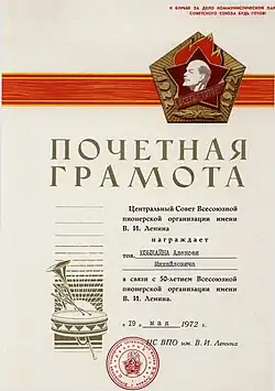 Почётная грамота, которой награждали в день 50-летия пионерской организации