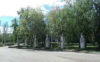 >Мемориал пионерам героям Великой Отечественной войны близ Тольятти, бывший пионерский лагерь «Алые паруса» (справа налево: Боря Цариков, Марат Казей, Зинаида Портнова, Лёня Голиков, Валя Котик и Володя Дубинин)