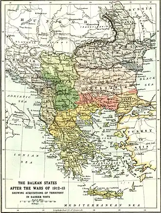 Часть Македонии присоединена к Сербии, другая — к Греции; Южная Добруджа присоединена к Румынии; Османская империя вернула восточную часть Западной Фракии. |