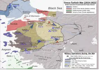 Вторая греко-турецкая война (греч. Μικρασιατική εκστρατεία; тур. Türk-Yunan Cephesi)[19] — военный конфликт между Грецией и кемалистской Турцией, связанный с греческими ирредентистскими планами. Несмотря на первоначальные успехи греческих войск, которым к лету 1921 года удалось оккупировать почти весь запад Малой Азии, война закончилась поражением Греции и подписанием в 1923 году Лозаннского мирного договора и последующим греко-турецким обменом населением.