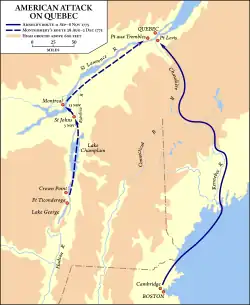 Экспедиция Монтгомери вышла из Тикондероги в конце августа, и в середине сентября начала осаду форта Сен-Жан — южного пункта обороны Монреаля. Когда в ноябре форт пал, Карлтон отступил к Квебеку, а Монреаль был взят американцами без боя. Монтгомери выступил из Монреаля на Квебек, хотя у его армии заканчивались сроки службы и она начала сокращаться в размере. Около Квебека Монтгомери соединился с армией Бенедикта Арнольда, которая вышла к Квебеку другим путём и тоже страдала от нехватки продовольствия и боеприпасов. Объединённые армии атаковали Квебек, но были разбиты в сражении при Квебеке 31 декабря 1775 года. Монтгомери погиб, Арнольд был ранен в ногу, а оборонявшиеся потеряли только несколько бойцов. С оставшимися силами Арнольд продолжал осаду города до мая 1776 года, но, когда англичане получили подкрепления, счёл благоразумным отвести свои войска. Правивший в Монреале генерал Дэвид Вустер своими действиями раздражил местных сторонников и противников американцев.