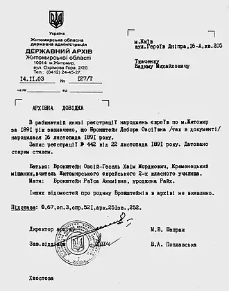 Архивные данные из Житомира о Бронштейн Деборе