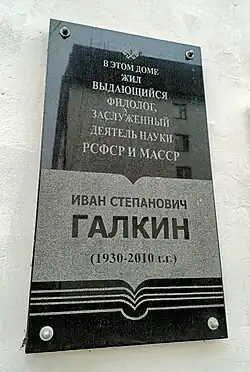 Мемориальная доска марийскому филологу, заслуженному деятелю науки РСФСР И. С. Галкину в Йошкар-ОлеПамятная доска на доме в Йошкар-Оле, где жил учёный[2].