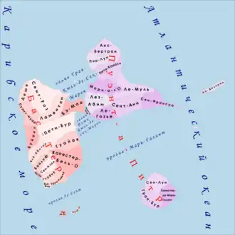 Карта заморского департамента Гваделупа до выделения из его состава заморских общин Сен-Бартельми и Сен-Мартен в феврале 2007 года
