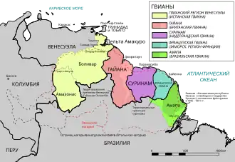 - Гайана (ранее — Британская Гвиана) — государство, расположенное между Гайанскими горами и рекой Корантейном.