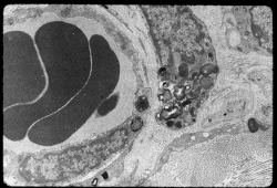 Электронно-микроскопическое изображение перицита (справа) и просвета сосуда с тремя эритроцитами (слева)