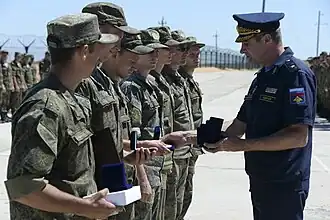 Генерал-майор ВКС России А. Я. Кобан проводит награждение победителей всеармейского состязания «Воздушные рубежи–2018».
