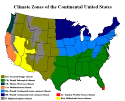 Из-за большого размера страны, её протяжённости и широкого разнообразия географических особенностей на территории США можно найти районы с практически любыми климатическими характеристиками. Бо́льшая часть США (штаты, расположенные к северу от 40 градуса с. ш.) располагается в зоне умеренного климата, южнее преобладает субтропический климат, Гавайи и южная часть Флориды лежат в зоне тропиков, а север Аляски относится к полярным регионам. Великие равнины к западу от 100-го меридиана относят к полупустыням, Большой Бассейн и области вокруг него имеют аридный, а прибрежные районы Калифорнии — средиземноморский климат. Тип климата в границах одного пояса может существенно меняться в зависимости от рельефа, близости океана и других факторов. Благоприятный климат оказал немалое влияние на заселение материка европейцами и во способствовал занятию США лидирующих позиций в мире.