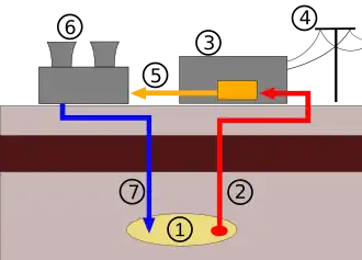 - Бинарная схема: в качестве рабочего тела используется не термальная вода или пар, а другая жидкость, имеющая низкую температуру кипения. Термальная вода пропускается через теплообменник, где образуется пар другой жидкости, используемой для вращения турбины. Такая схема используется, например, на геотермальной электростанции Ландау в Германии, где в качестве рабочего тела применяется изопентан.