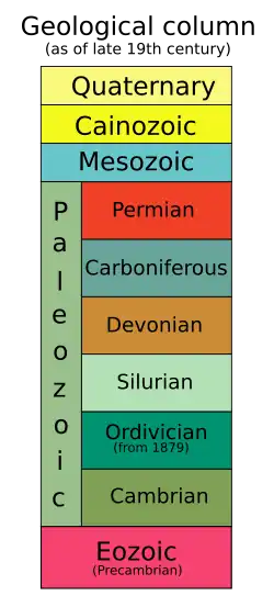 Время существования Земли разделено на два главных интервала: фанерозой и докембрий (криптозой) по появлению в осадочных породах ископаемых остатков. Криптозой — время скрытой жизни, в нём существовали только мягкотелые организмы, не оставляющие следов в осадочных породах. Фанерозой начался с появлением на границе эдиакария (венд) и кембрия множества видов моллюсков и других организмов, сохранившиеся остатки или следы которых позволяют палеонтологии расчленять толщи по находкам ископаемой флоры и фауны.