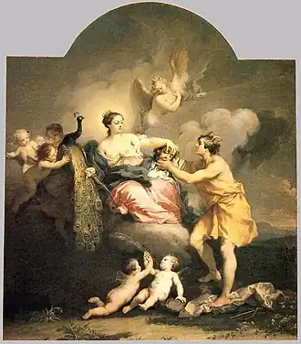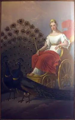 Гера (Юнона) отличается благородной, статной красотой[98]. Иногда на ней надета диадема или корона[98]. В изображении олимпийцев она сидит на троне рядом с Юпитером в самом центре.