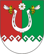 В рассеченном червленью и изумрудом поле серебряная дважды гамированая оконечность, над которой серебряная подкова шипами вверх, увершенная белой геральдической астрой с золотыми чашелистиками и семенником, на шипах подковы две противопоставленные пчелы с четырежды опоясанными брюшками и черными глазами. [1]