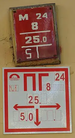 Для нахождения пожарных гидрантов на стенах зданий и сооружений, напротив которых установлен гидрант, прикрепляют указательную табличку, выполненную с использованием флуоресцентных или светоотражающих покрытий. На табличке указаны символы пожарного гидранта и цифровые значения, указывающие расстояния в метрах от указателя до гидранта. В Санкт-Петербурге указательная табличка городских пожарных гидрантов размера 12×16 см, красного цвета и имеет надпись символов и цифровых значений белого цвета. На ней, кроме того, указаны номер пожарного гидранта, внутренний диаметр водопровода в дюймах. Буква Т на табличке указывает, что гидрант расположен на тупиковой сети водопровода, буква М — гидрант московского типа, Л — гидрант ленинградского типа[5].