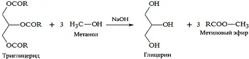 - Для изготовления биодизельного топлива — получаемого из растительных масел и используемого для замены обычного дизельного топлива. Для получения биодизеля к девяти массовым единицам растительного масла добавляется одна массовая единица спирта (то есть соблюдается соотношение 9:1), а также щелочной катализатор (NaOH). Полученный эфир (главным образом линолевой кислоты) отличается хорошей воспламеняемостью, обеспечиваемой высоким цетановым числом. Цетановое число — условная количественная характеристика самовоспламеняемости дизельных топлив в цилиндре двигателя (аналог октанового числа для бензинов). Если для минерального дизтоплива характерен показатель в 50—52 %, то метиловый эфир уже изначально соответствует 56—58 % цетана. Сырьём для производства биодизеля могут быть различные растительные масла: рапсовое, соевое и другие, кроме тех, в составе которых высокое содержание пальмитиновой кислоты (пальмовое масло). При его производстве в процессе этерификации также образуется глицерин, который используется в пищевой, косметической и бумажной промышленности, либо перерабатывается в эпихлоргидрин по методу Solvay.