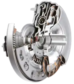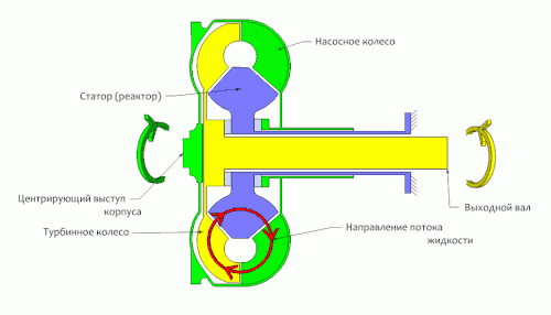 - так называемого статора (реактора, направляющего аппарата) — специальной крыльчатки, установленной на пути жидкости непосредственно на выходе из турбины. Статор закреплён на обгонной муфте (муфте свободного хода), позволяющей ему свободно вращаться только в одну сторону (в ту же, в какую вращается турбина).