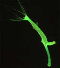Трансгенная гидра Hydra vulgaris линии AEP с энтодермальными клетками, в которых экспрессируется зелёный флуоресцентный белок